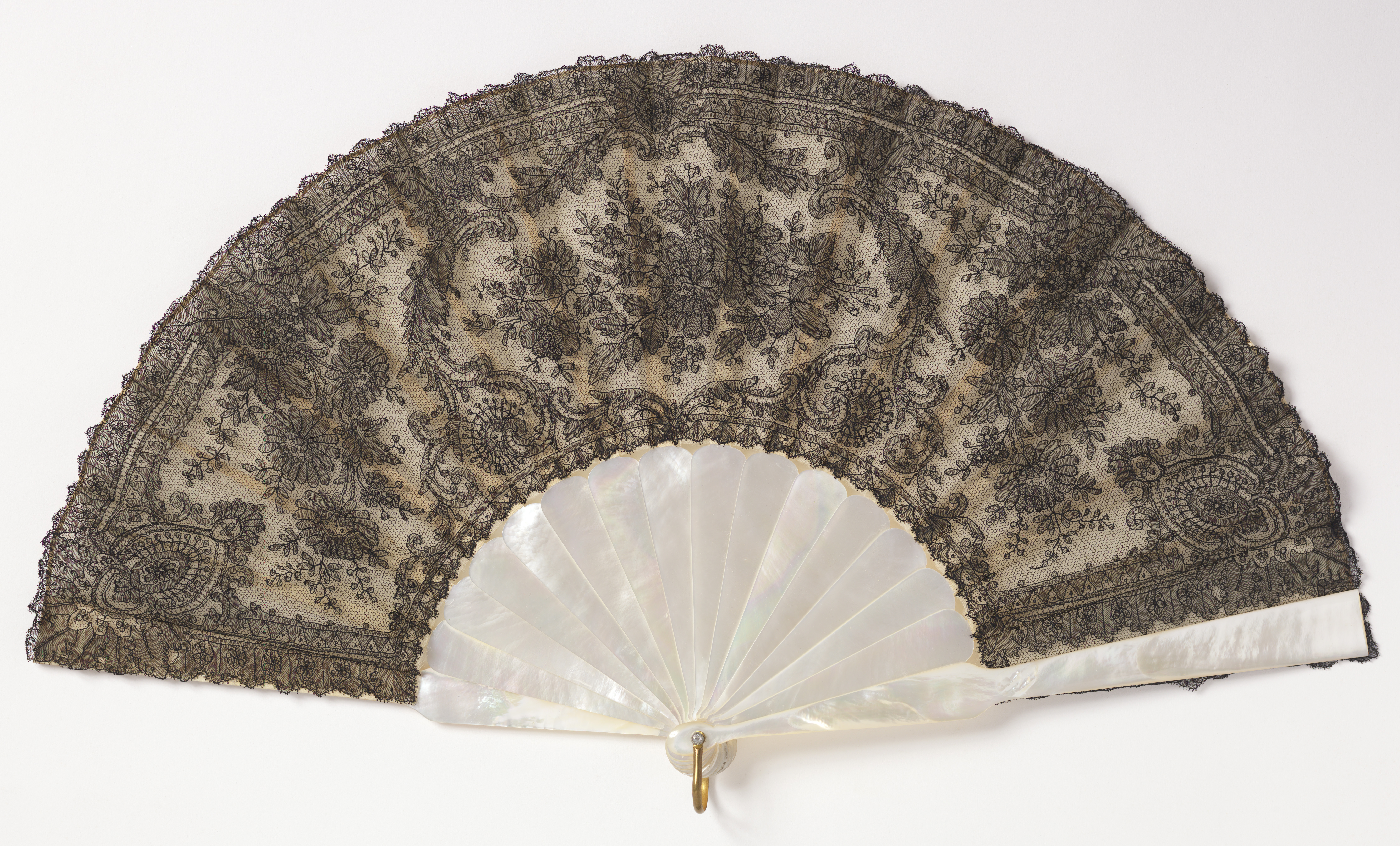 This is a Pleated fan and case. It was distributed by Tiffany and Co.. It is dated late 19th century and we acquired it in 1952. Its medium is silk bobbin lace leaf backed with silk, mother-of-pearl sticks, paste jewel at rivet. It is a part of the Textiles department.