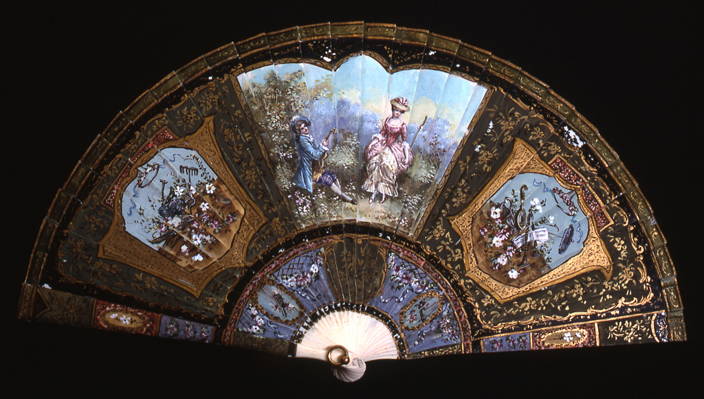This is a Brisé fan and case. It is dated late 19th–early 20th century and we acquired it in 1952. Its medium is painted ivory sticks, silk ribbon, metal bail. It is a part of the Textiles department.
