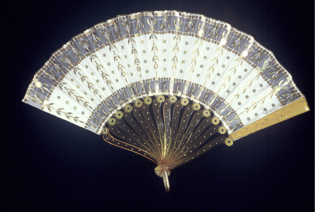 This is a Pleated pocket fan and case. It is dated late 19th–early 20th century and we acquired it in 1952. Its medium is silk leaf with applied silk, gilt sequins; shell-like sticks inlaid with gilt piqués, gilt metal bail. It is a part of the Textiles department.