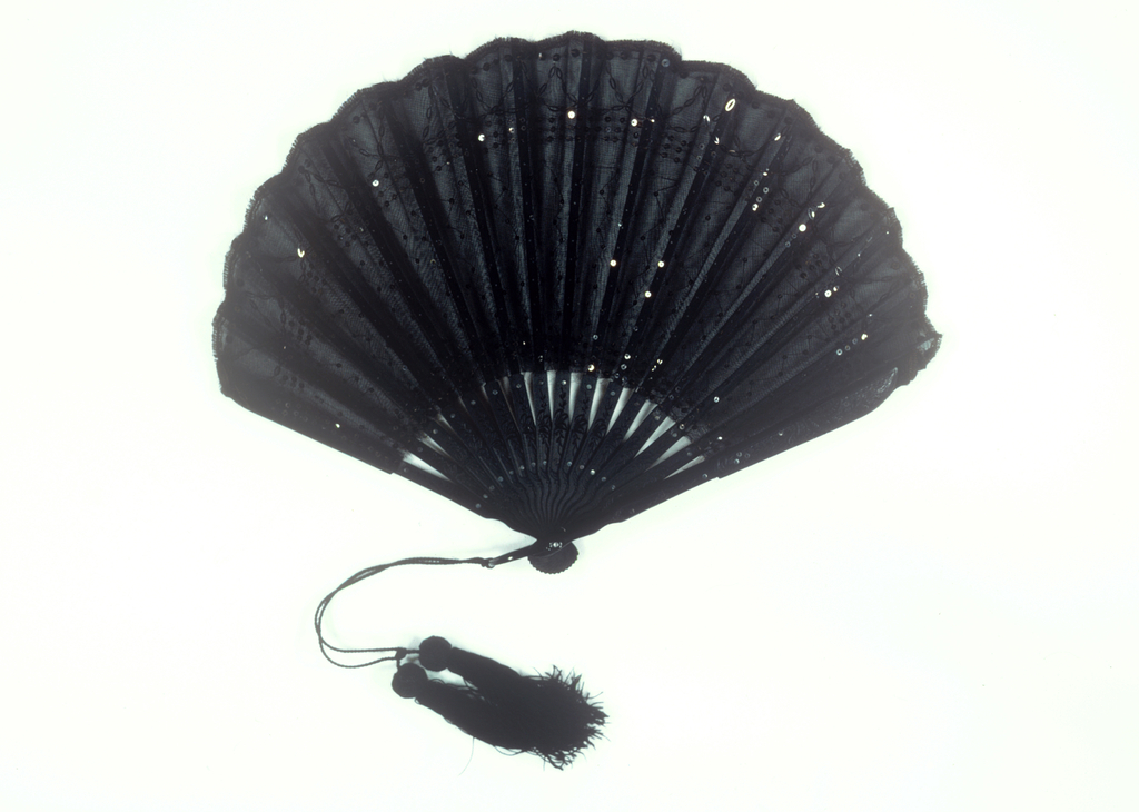 This is a Pleated mourning fan. It is dated early 20th century and we acquired it in 1952. Its medium is silk leaf embroidered with plastic sequins, wood sticks incised and inlaid with steel piqués, metal bail, silk tassel. It is a part of the Textiles department.
