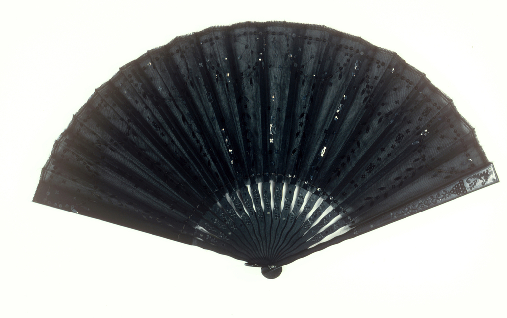 This is a Pleated mourning fan. It is dated early 20th century and we acquired it in 1952. Its medium is silk leaf embroidered with plastic sequins, wood sticks incised and inlaid with plastic piqués, metal bail. It is a part of the Textiles department.