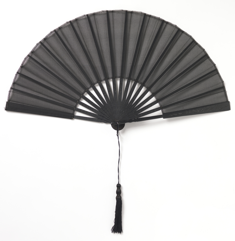 This is a Pleated mourning fan. It is dated early 20th century and we acquired it in 1952. Its medium is silk leaf, carved and incised wood sticks, silk tassel. It is a part of the Textiles department.