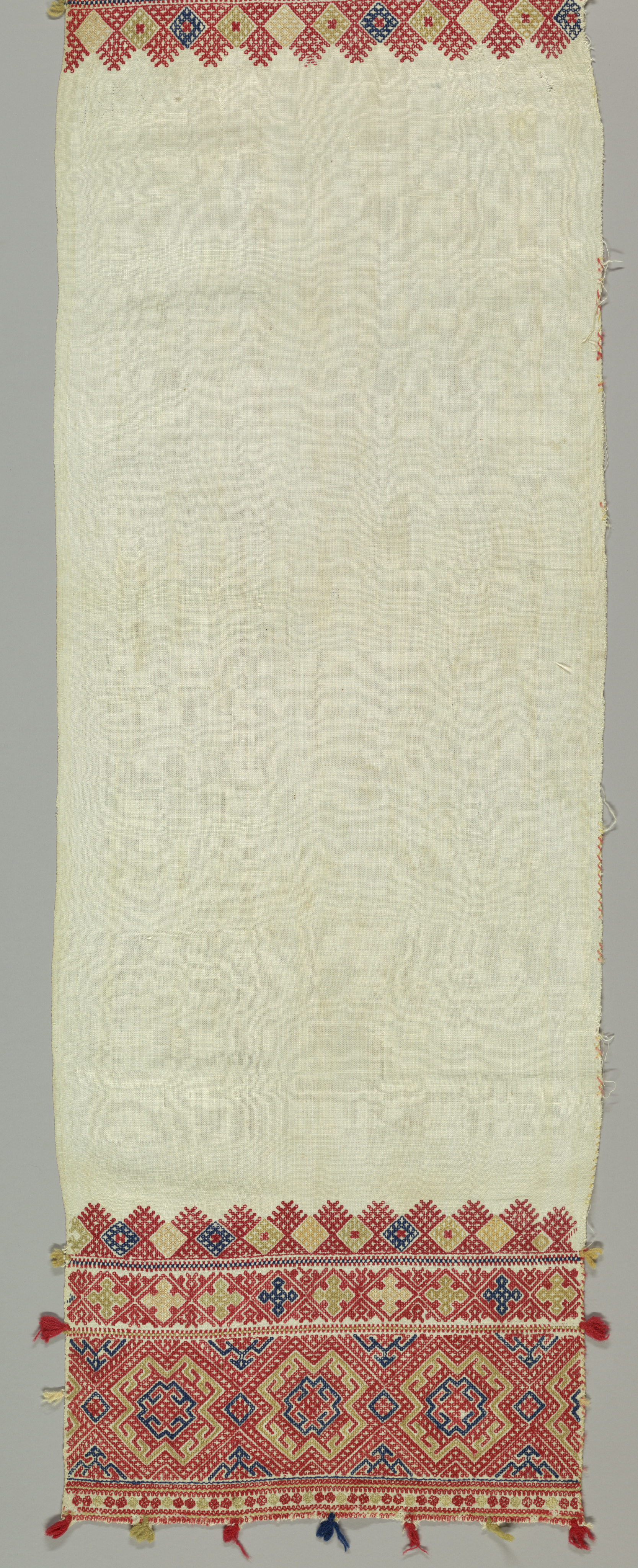 This is a Scarf. It is dated 18th–early 19th century and we acquired it in 1952. Its medium is wool on linen and its technique is embroidered. It is a part of the Textiles department.
