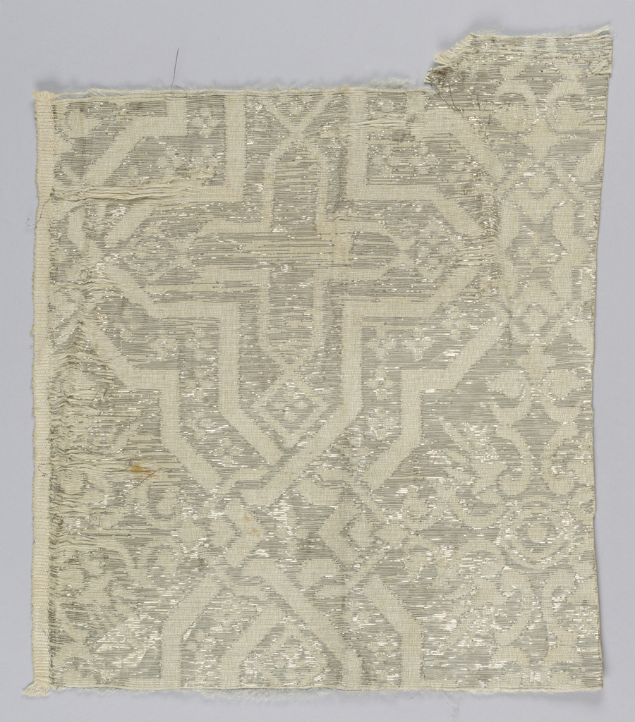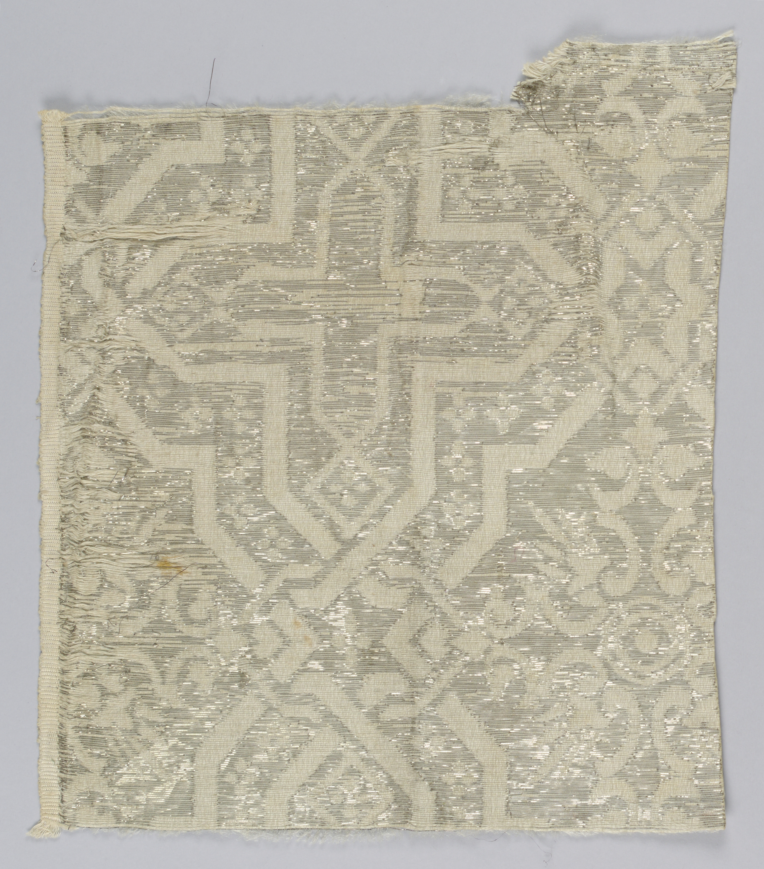 This is a Textile. It is dated 18th–19th century and we acquired it in 1952. Its medium is silk, cotton, metallic foil and its technique is satin weave. It is a part of the Textiles department.