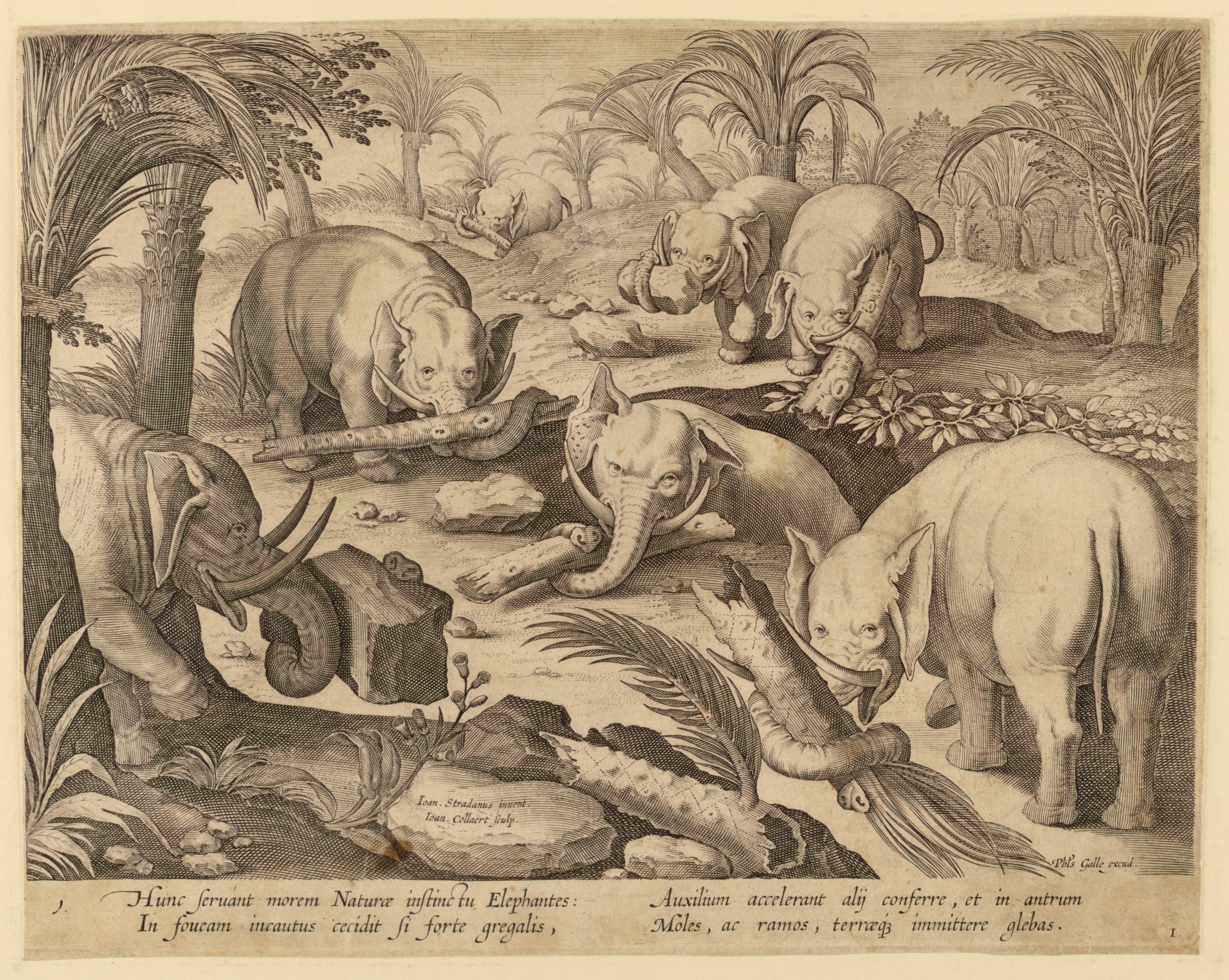 Near left center: Ioan Stradanus invent. / Ioan Collaert Sculp; At lower right: Phls Galle excud.; Below: HUNC SERVANT MOREM NATURAE INSTINCTII ELEPHANTIS...; Lower left: l [lowercase]; Lower right: I [uppercase]
