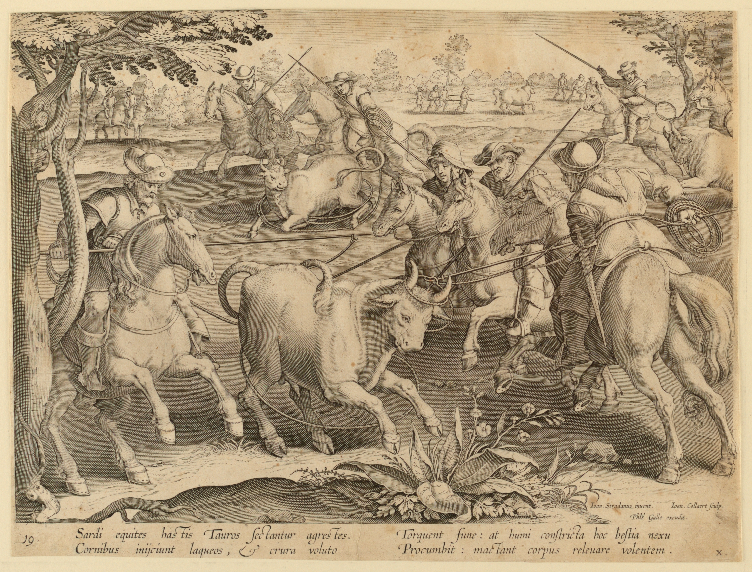 At lower right: Ioan. Stradanus invent. / Ioan. Collaert Sculp. / Phls. Galle excudit.; Below: SARDI EQUITIES HAS TIS TAUROS SECTANTUR AGRESTES; Lower left: 19; Lower right: X