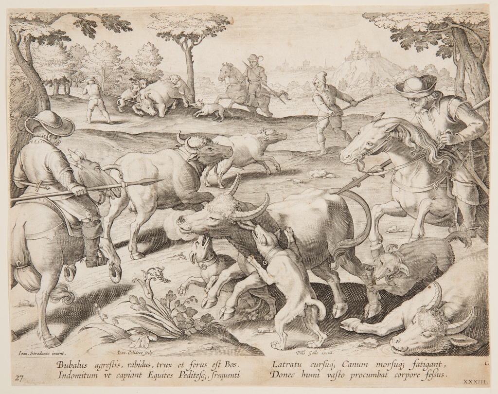 At lower left: Ioan Stradanus invent. Ioan. Collaert Sculp.; At right: Phls. Galle excud. Below: BUBALUS AGRESTIS, RABIDUS, TRUX ET FERUS EST BOS...; Lower left: 27; lower right: XXXIII