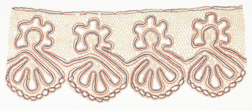 This is a Fragment. It is dated 19th–20th century and we acquired it in 1952. Its medium is cotton, wool (cat card 1966) and its technique is bobbin lace, eastern european, peasant style. It is a part of the Textiles department.