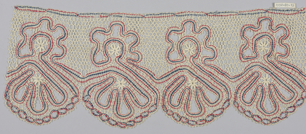 This is a Fragment. It is dated 19th–20th century and we acquired it in 1952. Its medium is cotton, wool (cat card 1966) and its technique is bobbin lace, eastern european, peasant style. It is a part of the Textiles department.