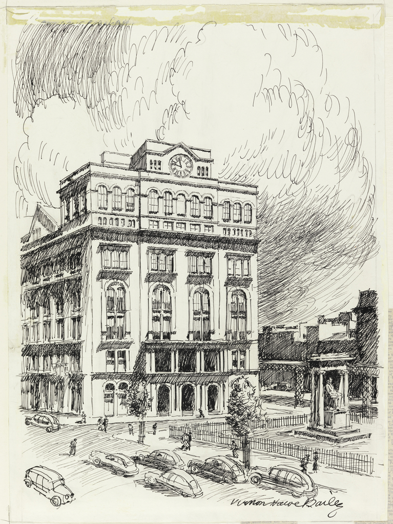 This is a Drawing. It was created by Vernon Howe Bailey and subject: Cooper Union. It is dated 1940–50 and we acquired it in 1953. Its medium is pen and black ink on white paper. It is a part of the Drawings, Prints, and Graphic Design department.
