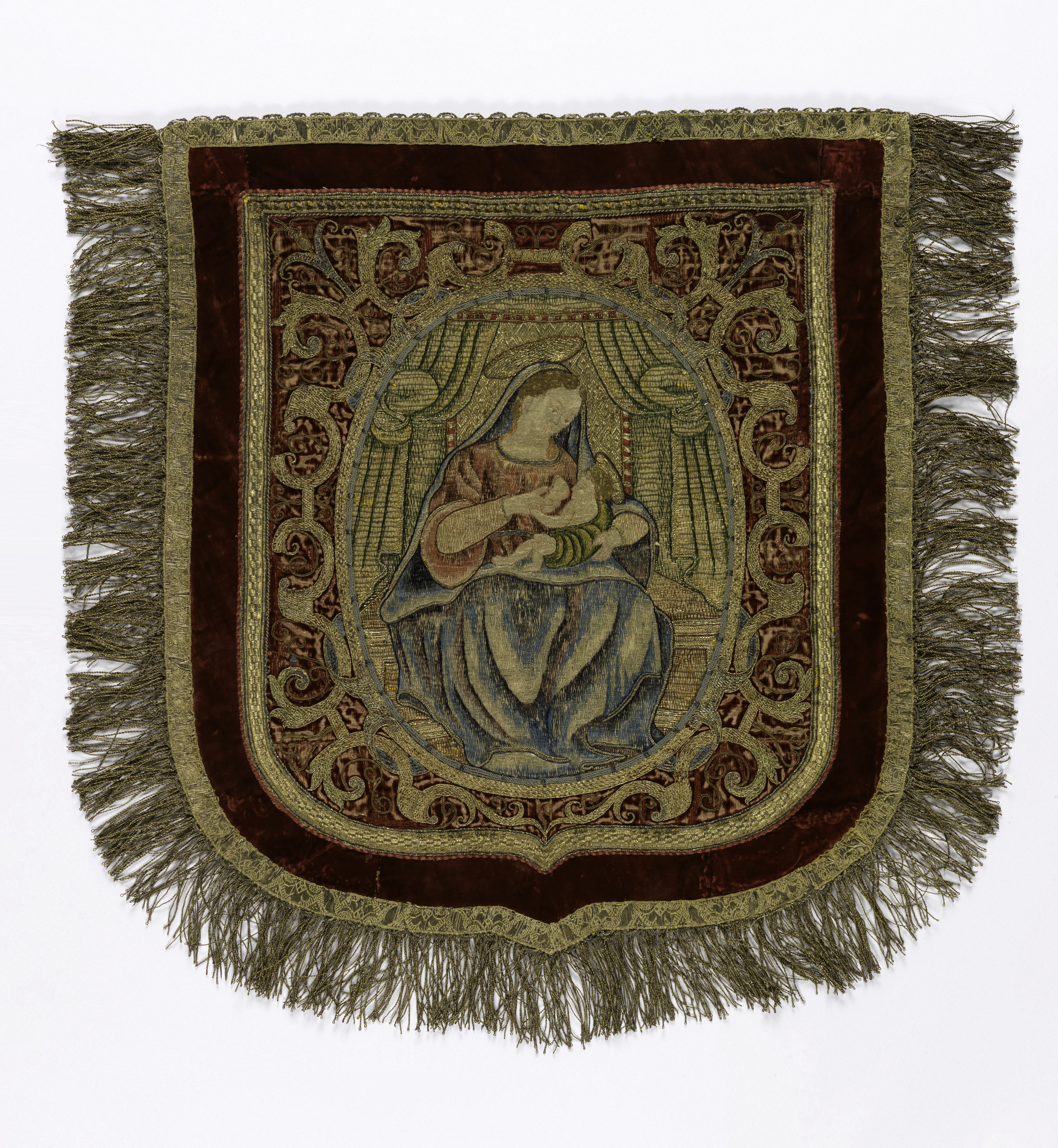 This is a Cope hood. It is dated 16th century and we acquired it in 1953. Its medium is linen, silk, metal and its technique is embroidered and couched on cut velvet weave. It is a part of the Textiles department.