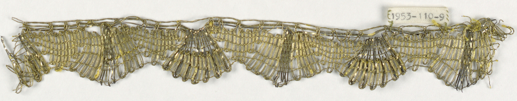 This is a Trimming. We acquired it in 1953. Its medium is metallic wound on yellow silk and its technique is bobbin lace, metallic. It is a part of the Textiles department.