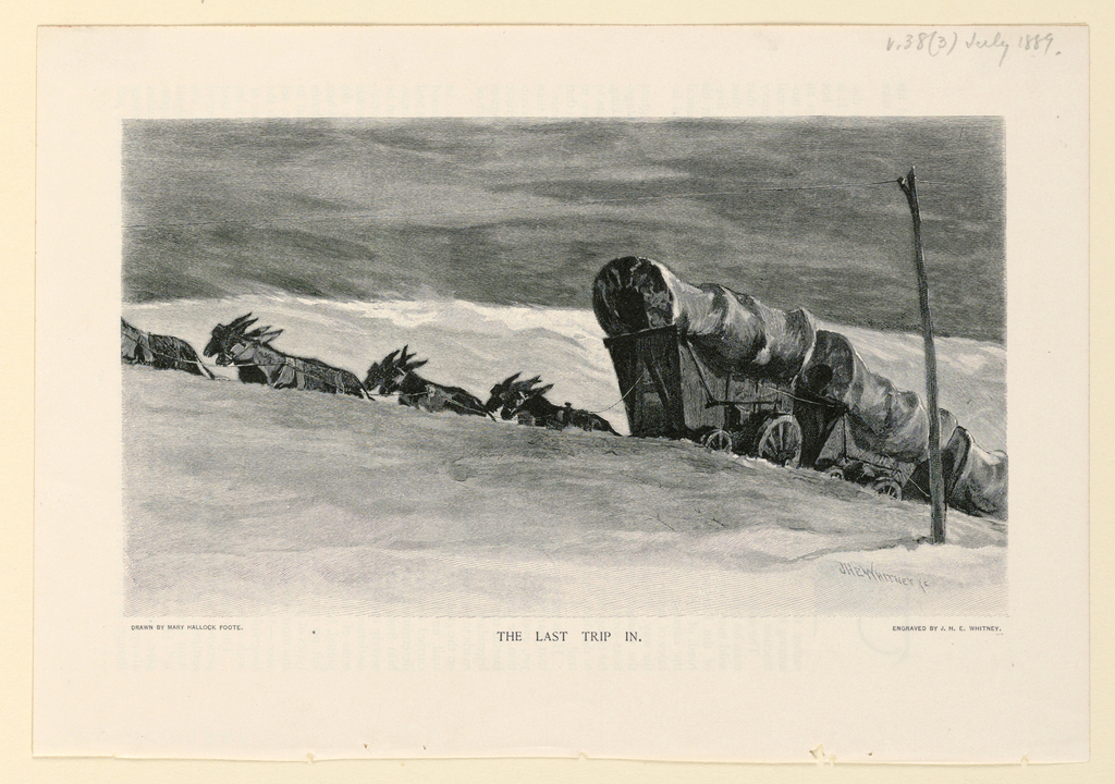 Print, The Last Trip In, Illustration for The Century Magazine (XXXVIII, No. 3, July 1889, p, 342); Mary A. Hallock Foote (American, 1847 – 1938); Engraved by J. H. E. Whitney; Published by The Century Company; USA; wood-engraving in black ink on paper; Platemark: 11.2 × 19.9 cm (4 7/16 × 7 13/16 in.) Sheet: 16.6 × 23.8 cm (6 9/16 × 9 3/8 in.); Gift of E. Maurice Bloch; 1953-130-3-b