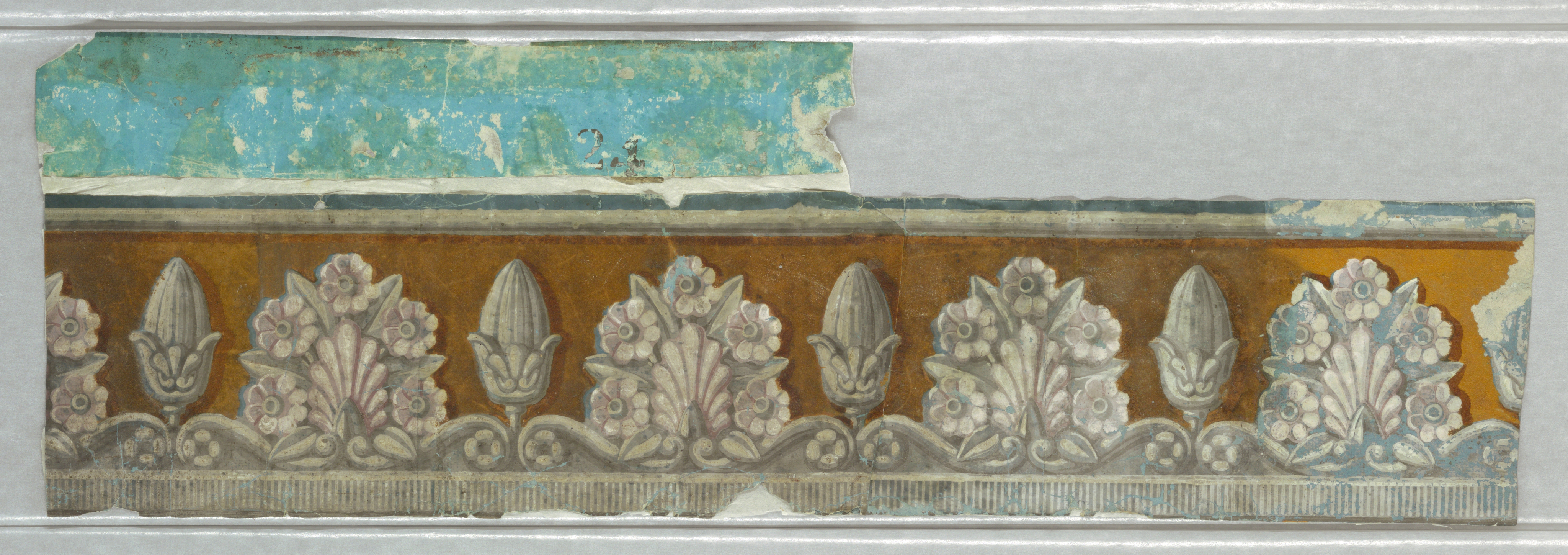 This is a Border and sidewall. It is dated 1805–20 and we acquired it in 1953. Its medium is block-printed on handmade paper. It is a part of the Wallcoverings department.