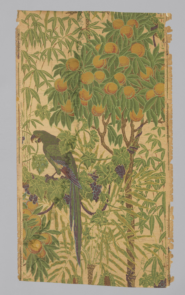 Sidewall, Macaw; Designed by Walter Crane ((English, 1845–1915)); Manufactured by Jeffrey & Company (United Kingdom); England; block-printed paper, embossed; 101 x 58 cm (39 3/4 x 22 13/16 in.); Gift of Edna de Frise; 1953-141-9