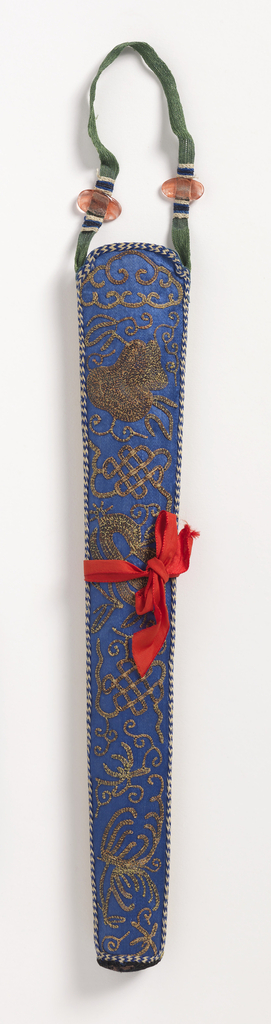 This is a Pleated fan and case. It is dated late 19th–early 20th century and we acquired it in 1953. Its medium is gilded and painted paper leaf, bamboo sticks, silk case embroidered with metallic yarns. It is a part of the Textiles department.