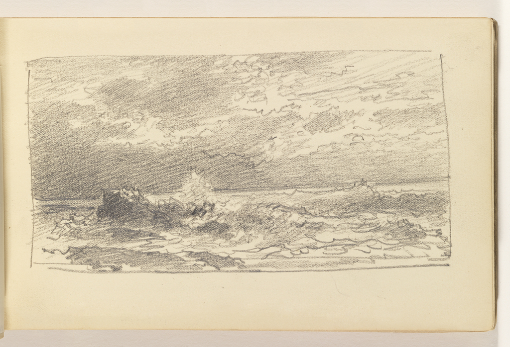 Sketchbook Folio, Ocean with Waves Breaking on Rock; William Trost Richards (American, 1833–1905); USA; graphite on cream wove paper, bound; 8.2 x 16 cm (3 1/4 x 6 5/16 in.) Sheet: 11.7 x 18.9 cm (4 5/8 x 7 7/16 in.); Gift of the National Academy of Design from the Mrs. William T. Brewster Bequest; 1953-179-84-37