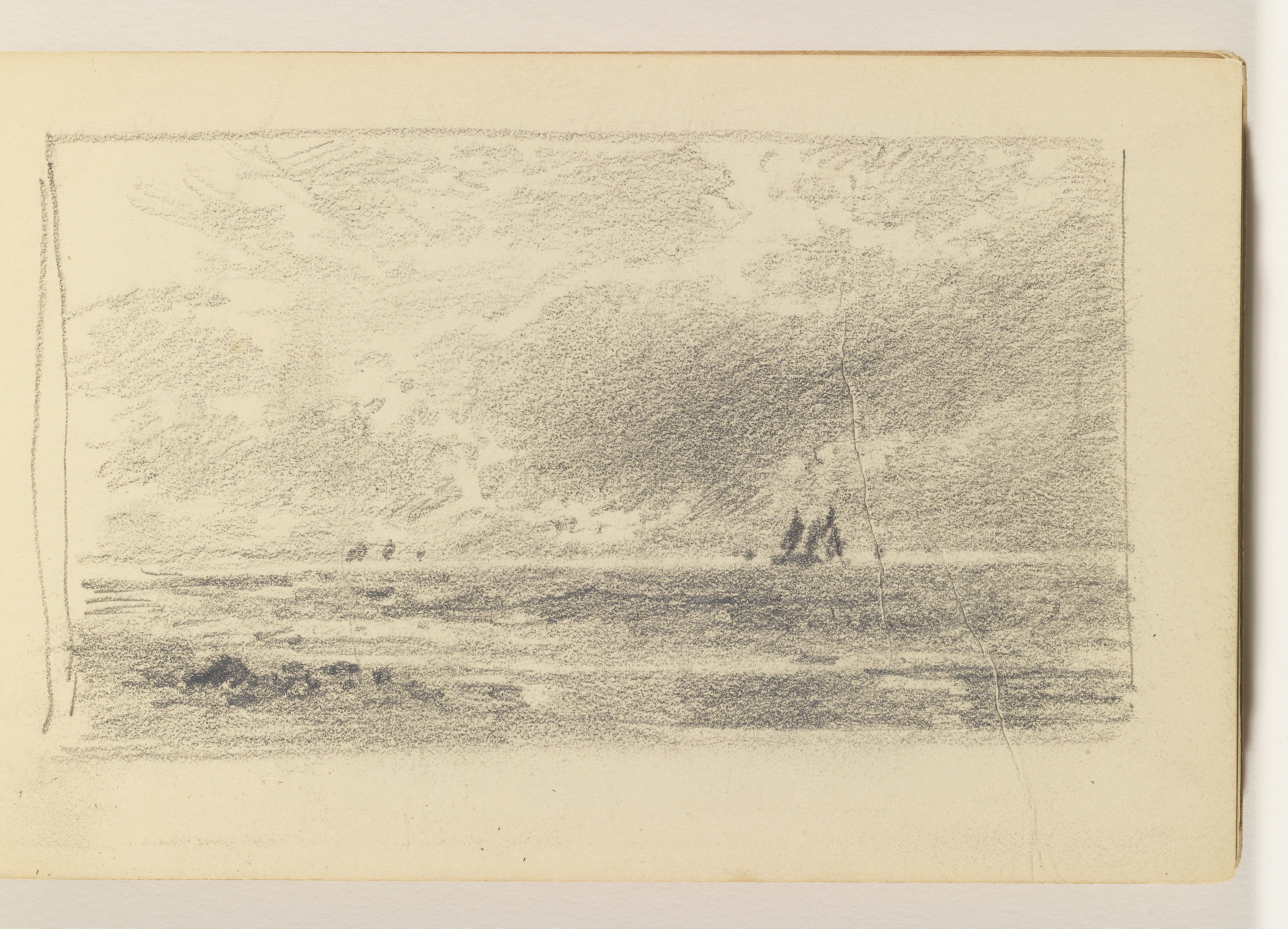 Sketchbook Folio, Calm Sea with Small Rocks and Several Distant Boats; William Trost Richards (American, 1833–1905); USA; graphite on cream wove paper, bound; 8.6 x 15.7 cm (3 3/8 x 6 3/16 in.) Sheet: 11.7 x 18.9 cm (4 5/8 x 7 7/16 in.); Gift of the National Academy of Design from the Mrs. William T. Brewster Bequest; 1953-179-84-9