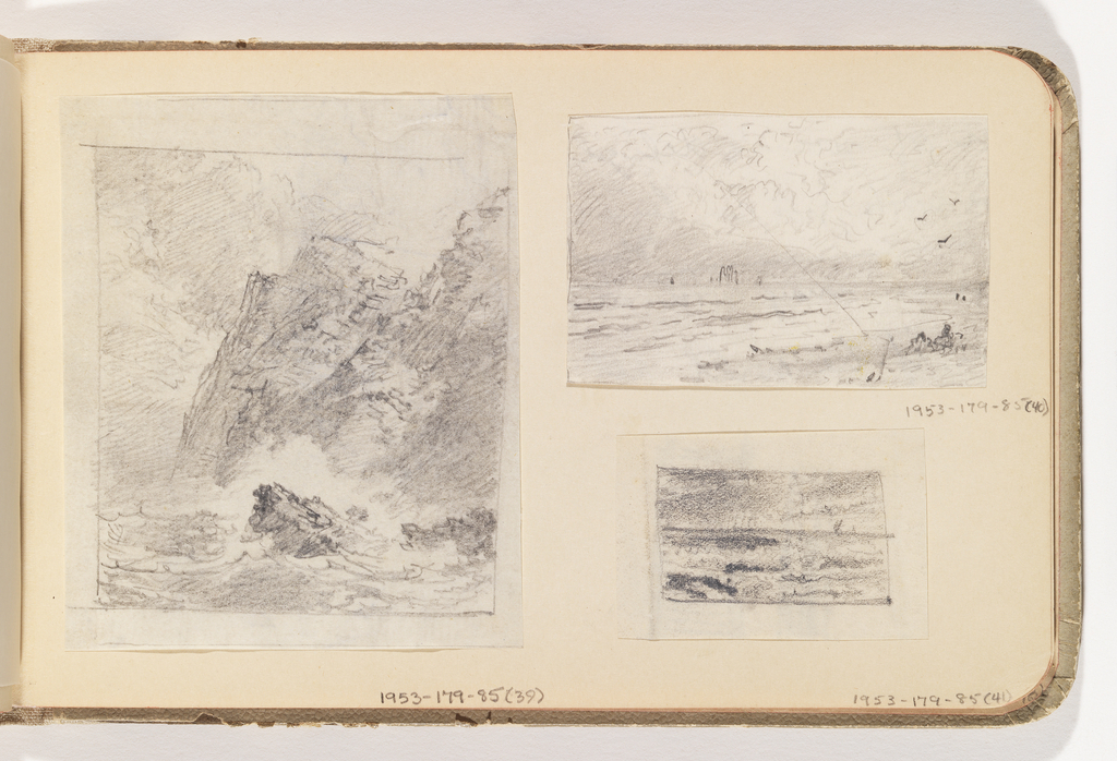 This is a Album page. It was created by William Trost Richards. It is dated late 19th century and we acquired it in 1953. Its medium is graphite on cream-colored paper, mounted. It is a part of the Drawings, Prints, and Graphic Design department.