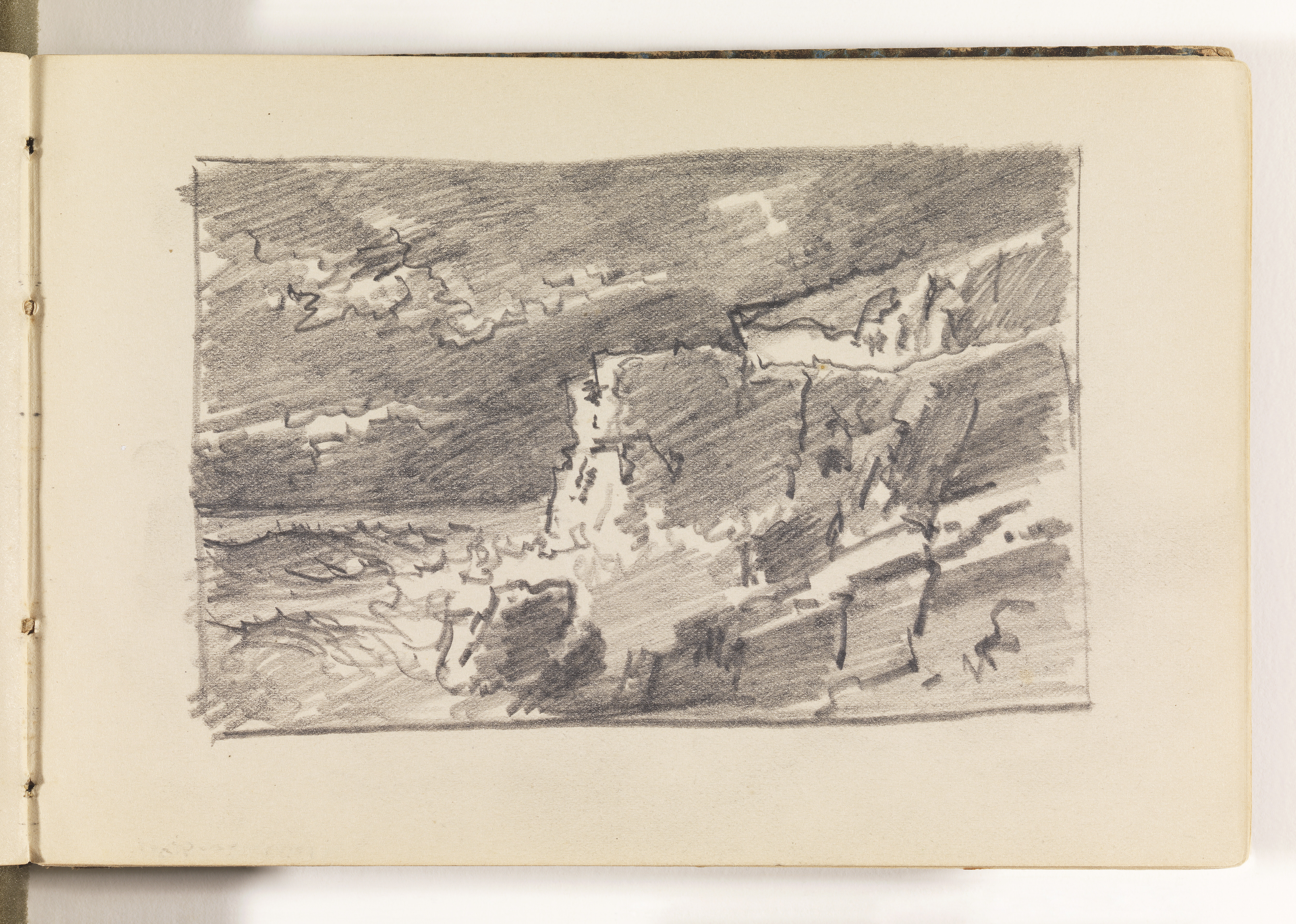 Sketchbook Folio, Rough Study of Cliffs and Waves with Dark Sky; William Trost Richards (American, 1833–1905); USA; graphite on cream wove paper, bound; 8.9 x 14 cm (3 1/2 x 5 1/2 in.), irregular Sheet: 12.8 x 19.2 cm (5 1/16 x 7 9/16 in.); Gift of the National Academy of Design from the Mrs. William T. Brewster Bequest; 1953-179-86-9