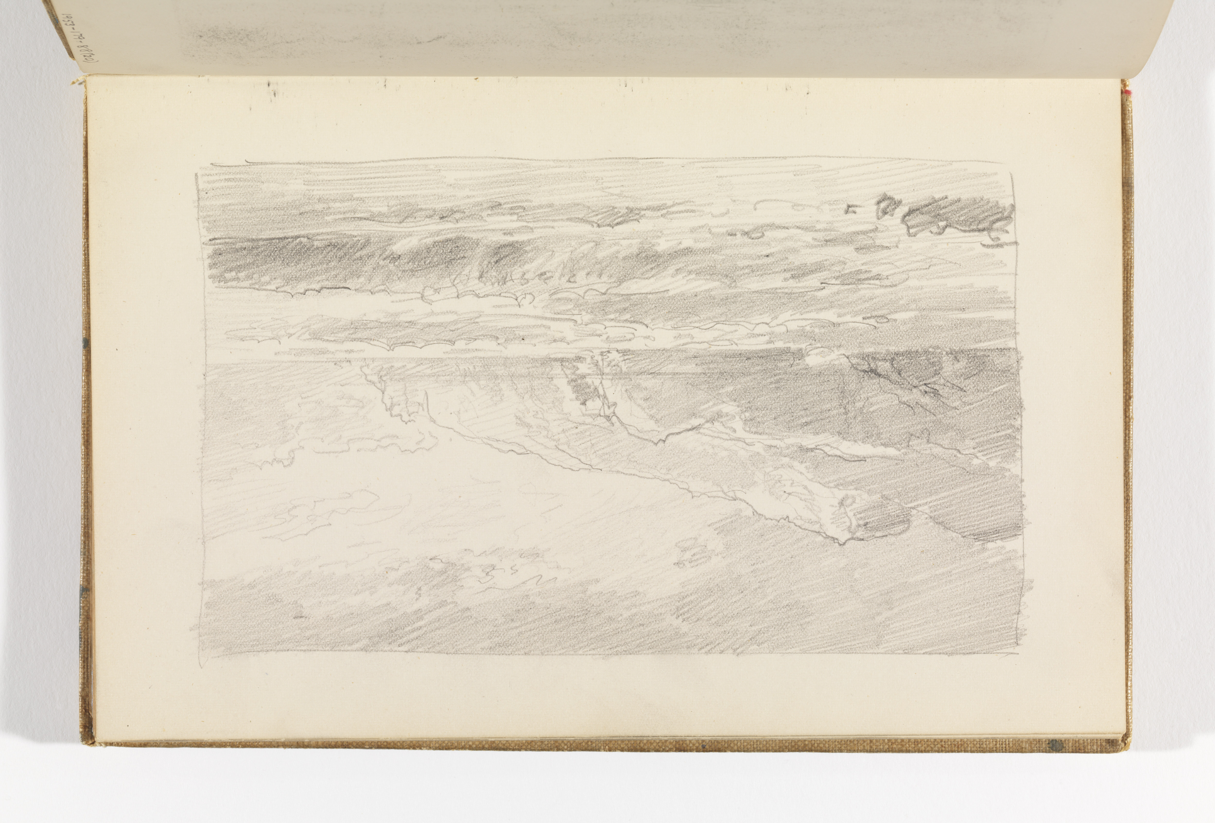 Sketchbook Folio, Waves Breaking on Beach with Cliffs; William Trost Richards (American, 1833–1905); USA; graphite on cream wove paper; 10.3 x 17 cm (4 1/16 x 6 11/16 in.) Sheet: 13.7 x 21.5 cm (5 3/8 x 8 7/16 in.); Gift of the National Academy of Design from the Mrs. William T. Brewster Bequest; 1953-179-88-21