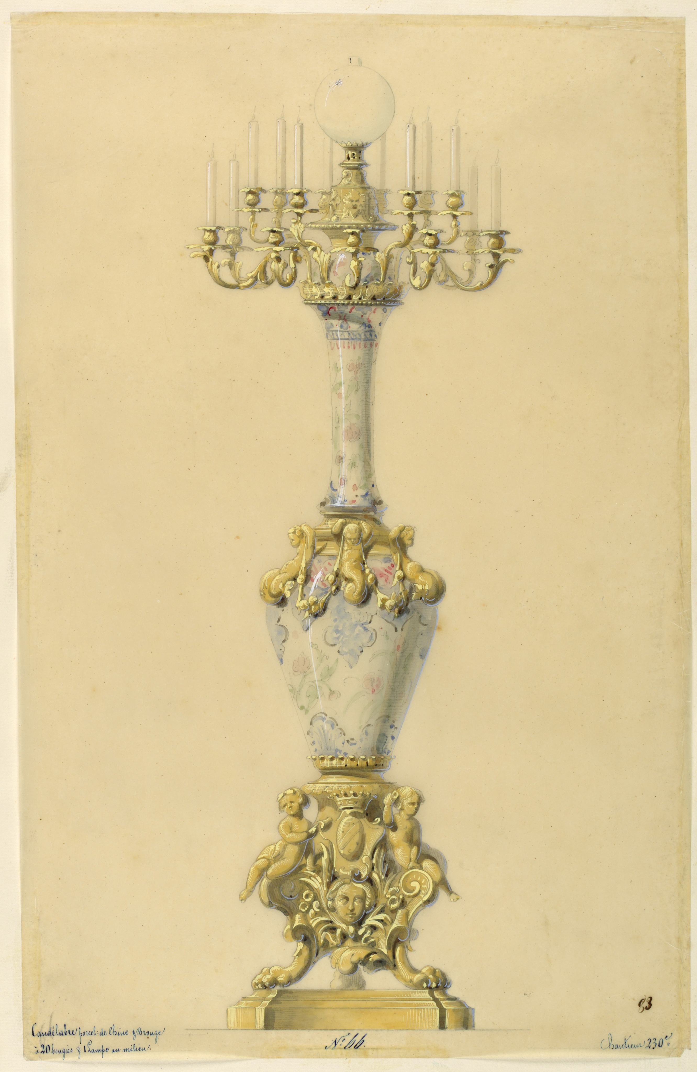 Lower left: Candelabre porcel: de Chine et Bronze/ a 20 bougies et Lampe au milieu. Lower center: N: 66. Lower right: Chantieur 230. Stamped above: 83