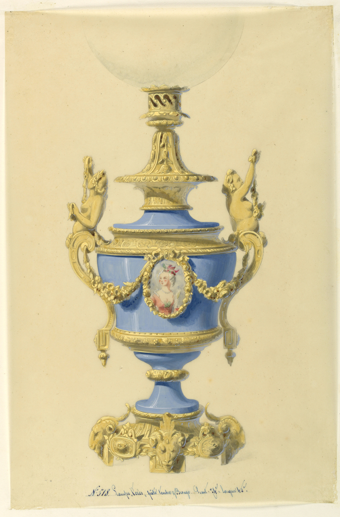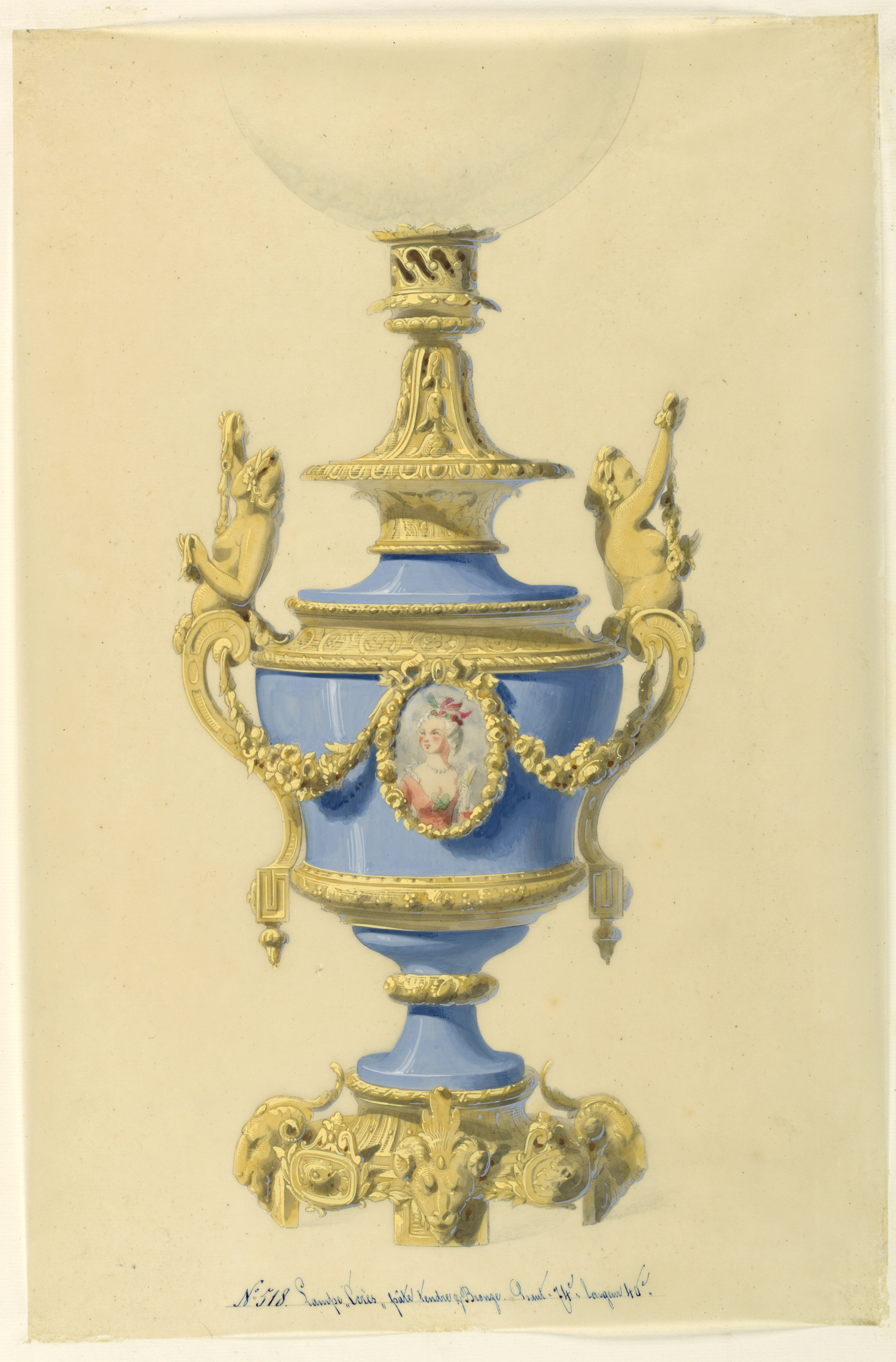 Drawing, Design for an Oil Lamp.; France; pencil, brush and ink, watercolor, tempera colors on tracing paper, tipped down.; Sheet: 43.5 x 28.5 cm (17 1/8 x 11 1/4 in.); Museum purchase from Pauline Riggs Noyes Fund; 1953-206-9