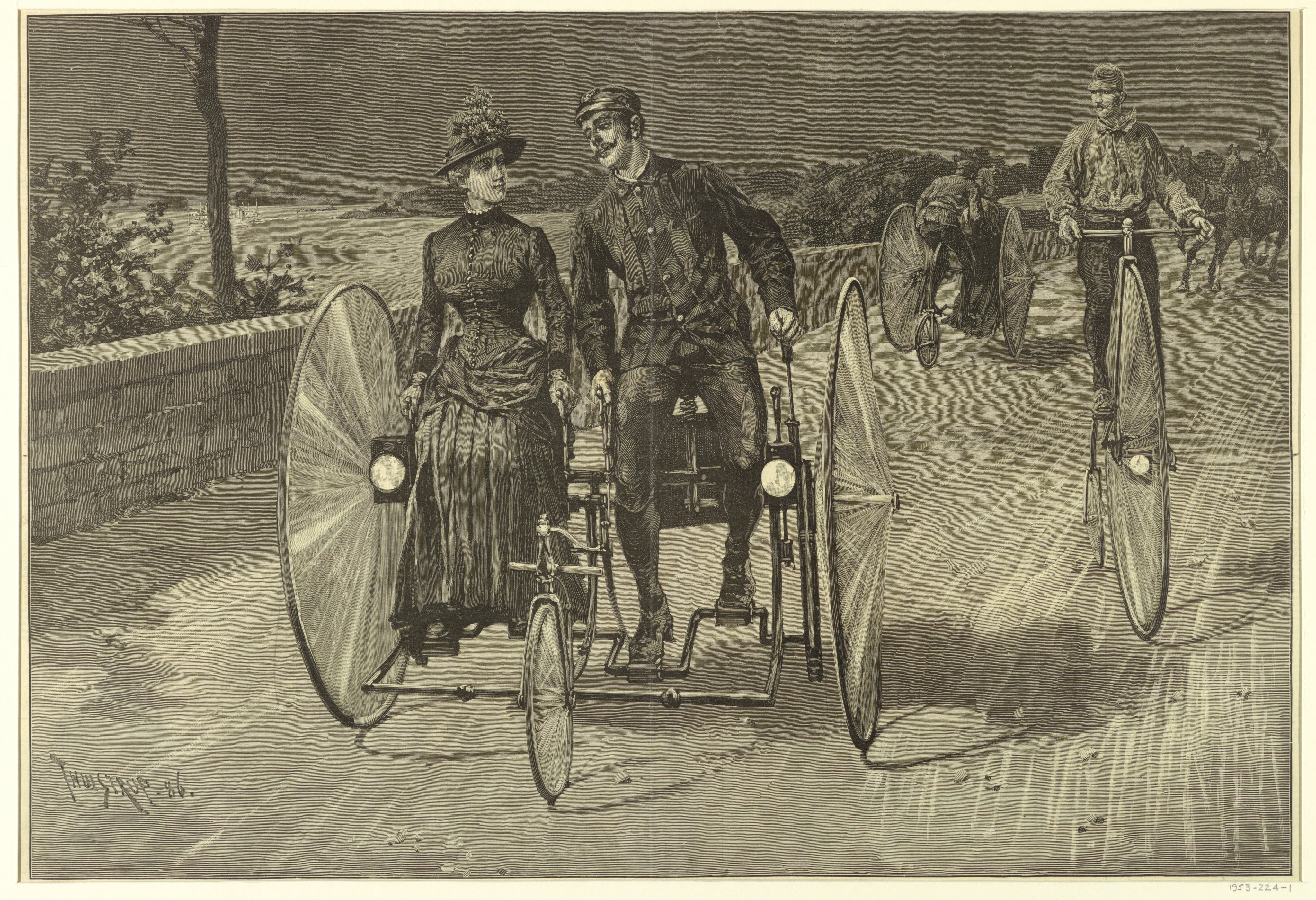 Print, Wheeling on Riverside Drive; Published by Harper's Weekly, Harper & Bros.; After Thure de Thulstrup; USA; wood engraving on white paper; 39 × 54 cm (15 3/8 × 21 1/4 in.); 1953-224-1