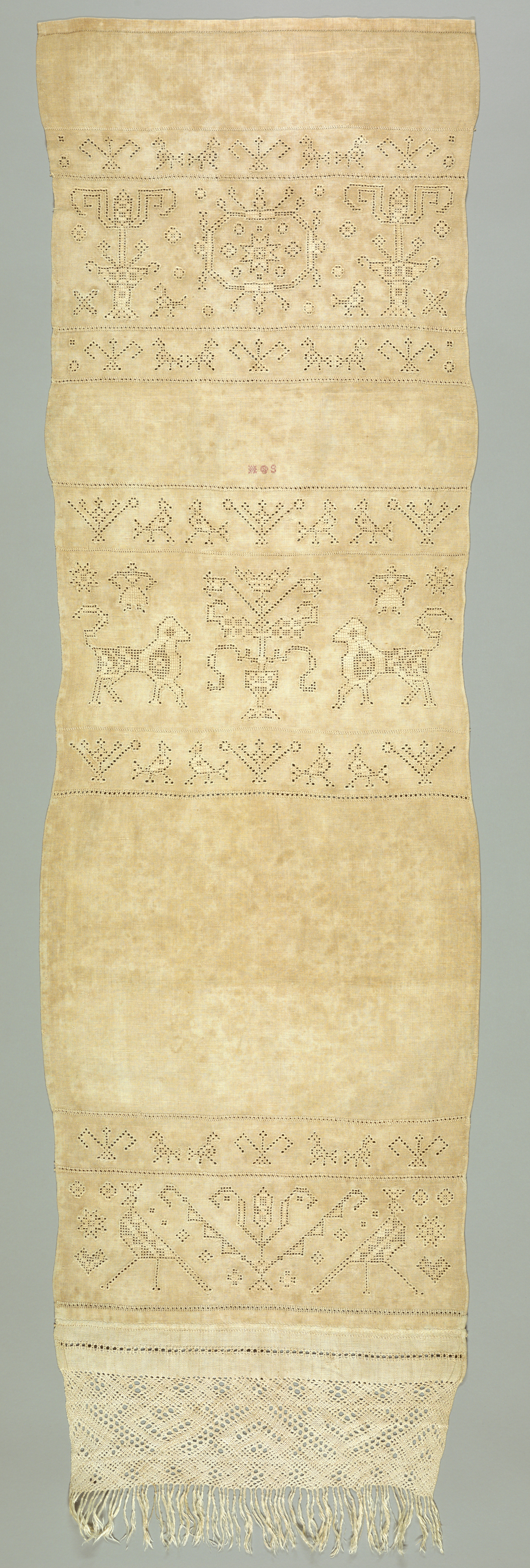 This is a Towel. It is dated 19th century and we acquired it in 1953. Its medium is linen and its technique is withdrawn element with darned motifs on plain weave. It is a part of the Textiles department.