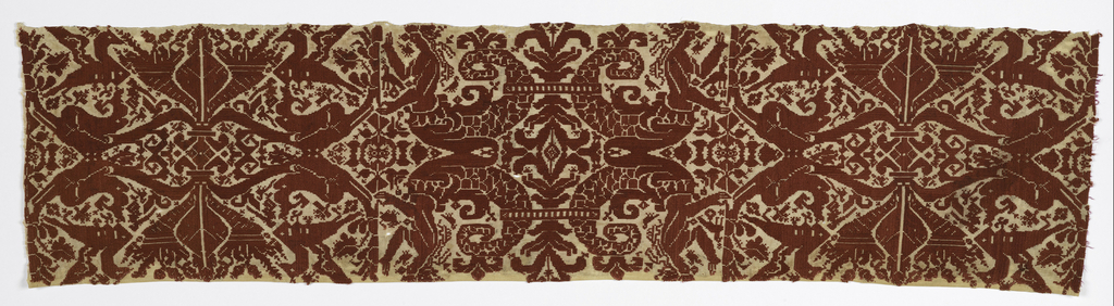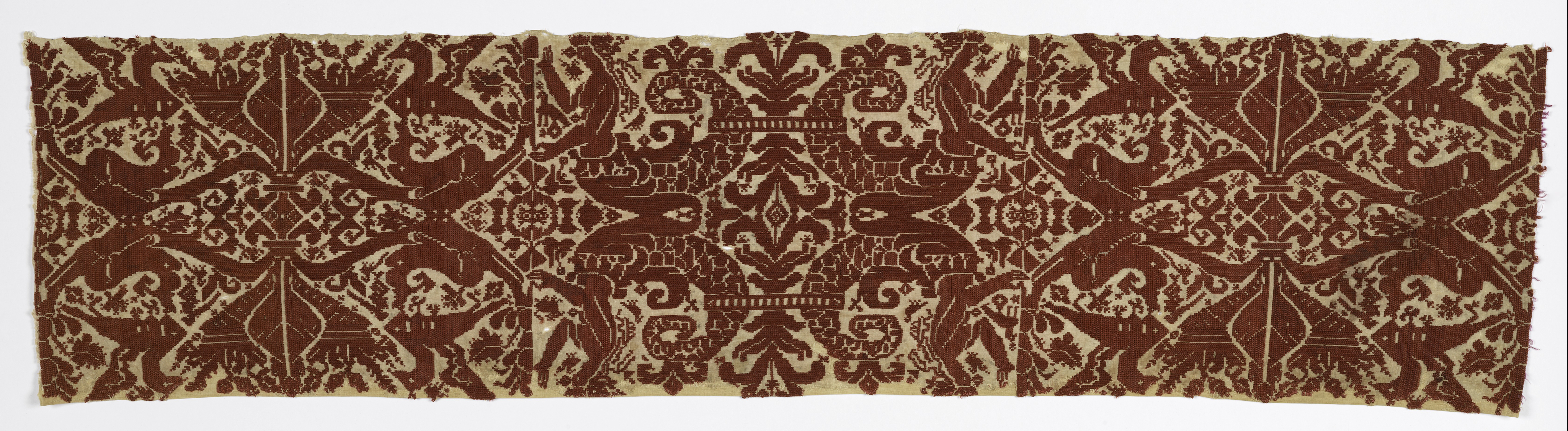 Red and white embroidered bands bearing designs from pattern books are ubiquitous in textile collections. They were used to decorate many types of domestic linens such as towels, bedding and cushion covers especially in Italy and Spain, which explains why so many examples exist today. Designs range from simple geometric shapes to more complex patterns showing architectural elements, human figures, animals and mythological creatures. Cooper-Hewitt’s band has a complex arrangement of birds and mermaids along with overflowing cornucopias and other scrolling shapes. The confronted birds with cornucopias are copied from Vavassore’s pattern book, but the addorsed mermaids with scrolling forms, a very common motif of the sixteenth century, are from another source. The top half of the design is reflected below in a mirror image.