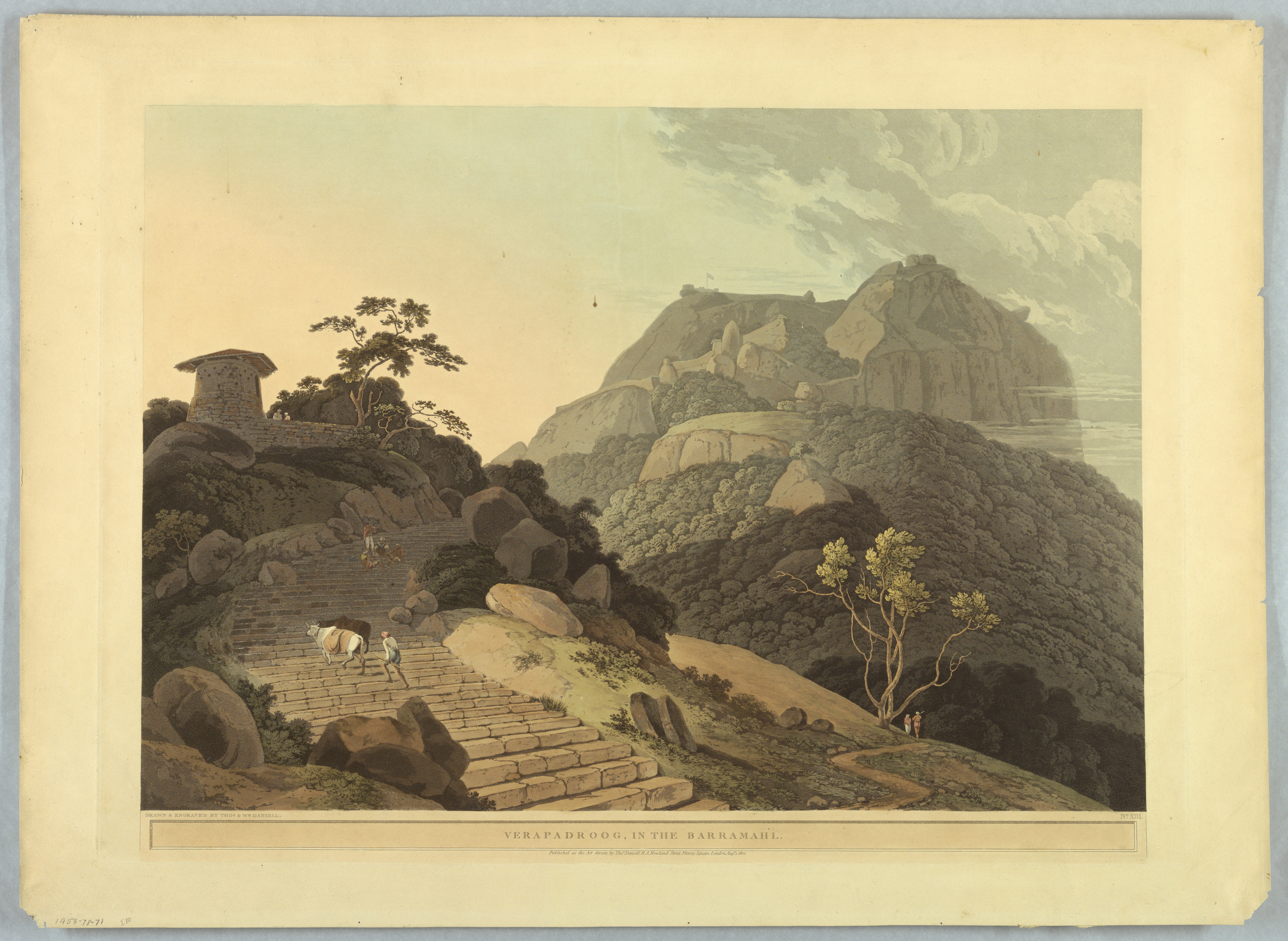 Print, Verapadroog, in the Barramahl, from "Oriental Scenery: Twenty Four Views in Hindoostan"; Print Maker: Thomas Daniell (British, 1749 - 1840); England; colored aquatint on paper; 1953-78-71