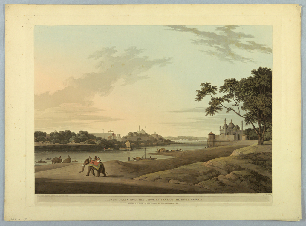 Print, Lucnow Taken From the Opposite Bank of the River Goomty, from "Oriental Scenery: Twenty Four Views in Hindoostan"; Print Maker: Thomas Daniell (British, 1749 - 1840); England; colored aquatint on paper; 1953-78-74