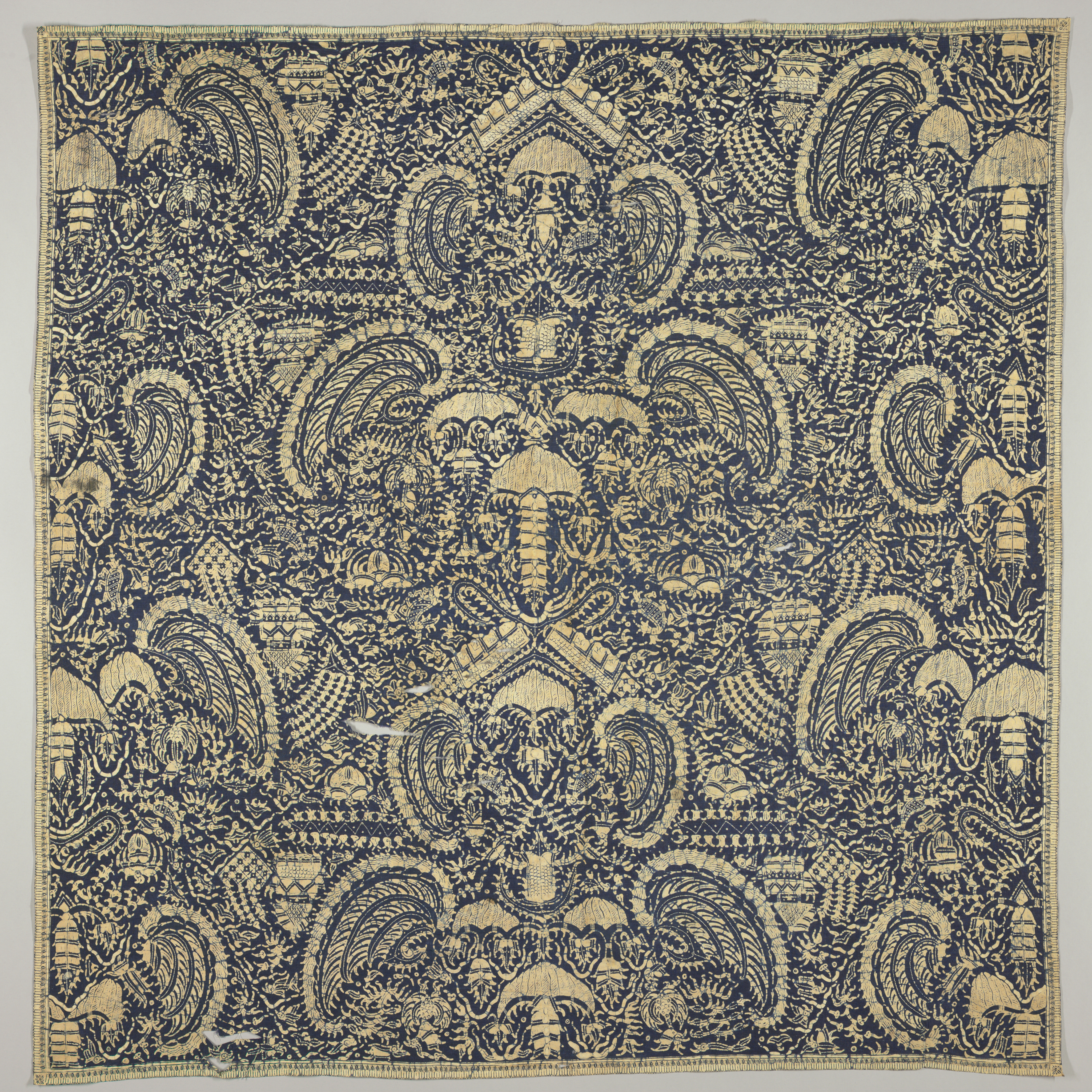 This is a Head cloth (kain kepala). It is dated early 19th century and we acquired it in 1953. Its medium is cotton and its technique is wax resist dyeing (batik) on plain weave. It is a part of the Textiles department.