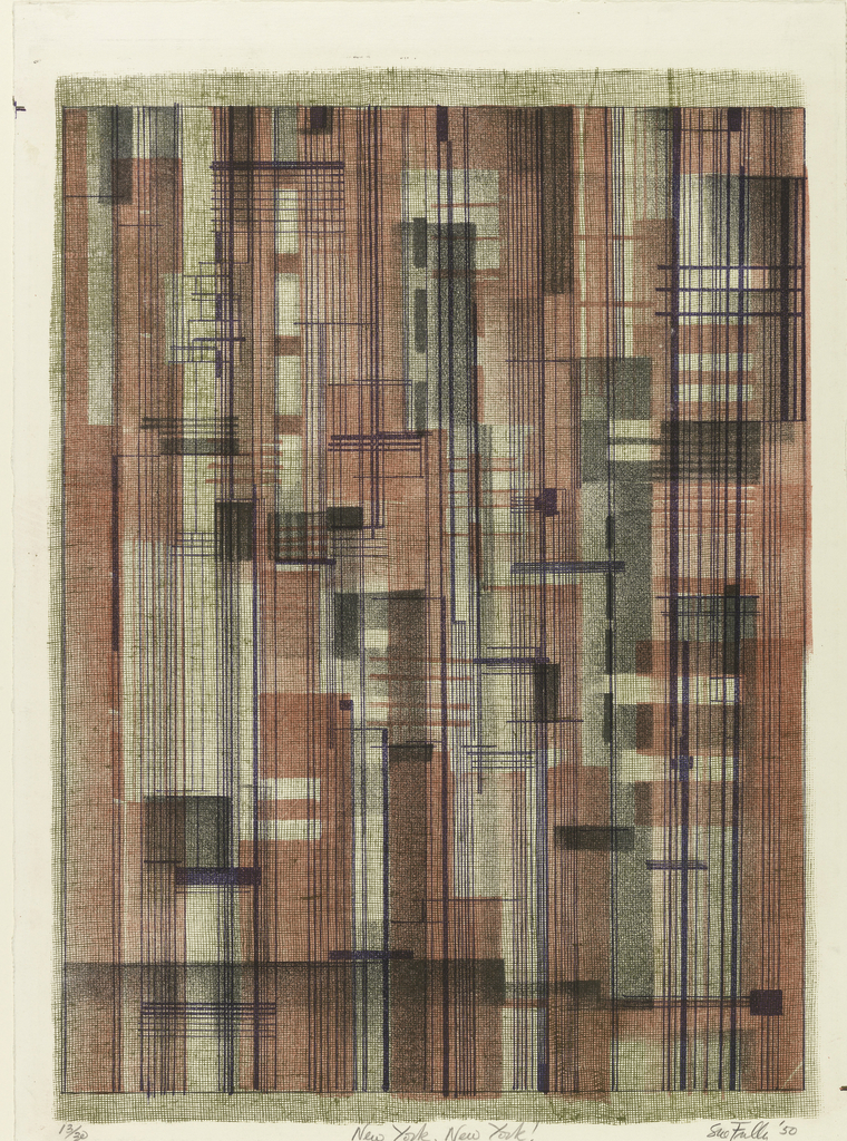 Print, New York, New York!; Sue Fuller (American, 1914 - 2006); USA; lithograph in three colors, stencil on paper; 62.8 × 42.8 cm (24 3/4 × 16 7/8 in.); 1954-161-2
