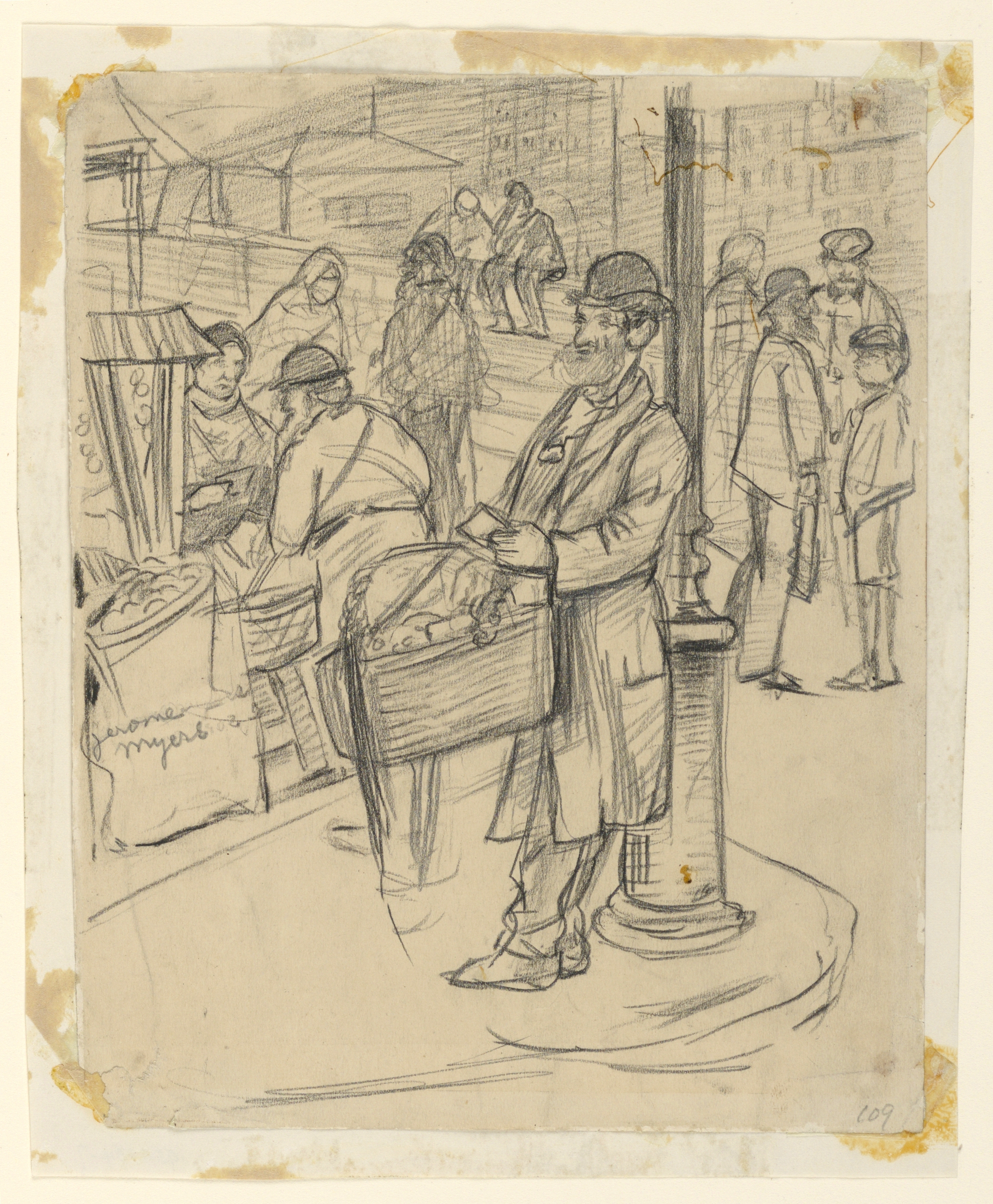 Drawing, The Peddler; Jerome Myers (American, 1867 - 1940); USA; graphite and black crayon on cream wove paper, laid down; 20.6 × 17.1 cm (8 1/8 × 6 3/4 in.); Gift of Mrs. Jerome Myers; 1954-34-9