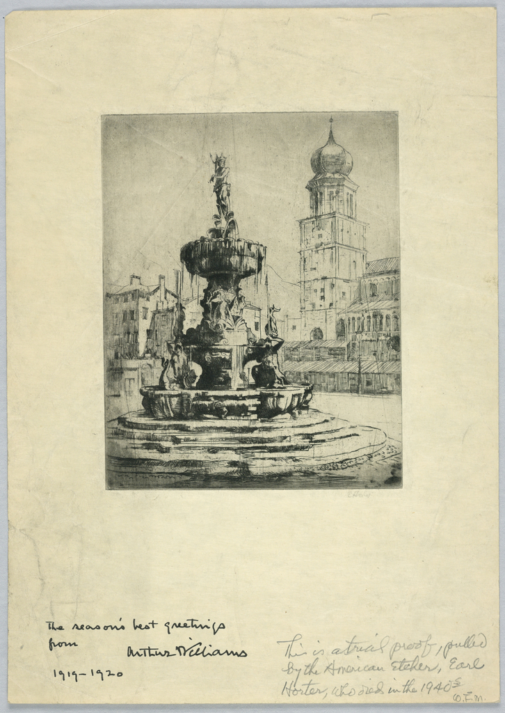 Inscribed in graphite, lower right: This is a trial proof, pulled / by the American Etcher, Earl / Horter, who dies in the 1940s / W.F.M.; in pen and black ink, lower left: The season's best greetings / from Arthur Williams / 1919-1920