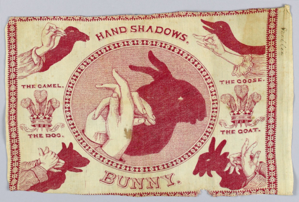 Panel, Hand Shadows; England; cotton; H x W: 19.1 × 28.6 cm (7 1/2 × 11 1/4 in.); Gift of Ruth Van Norman; 1955-119-1