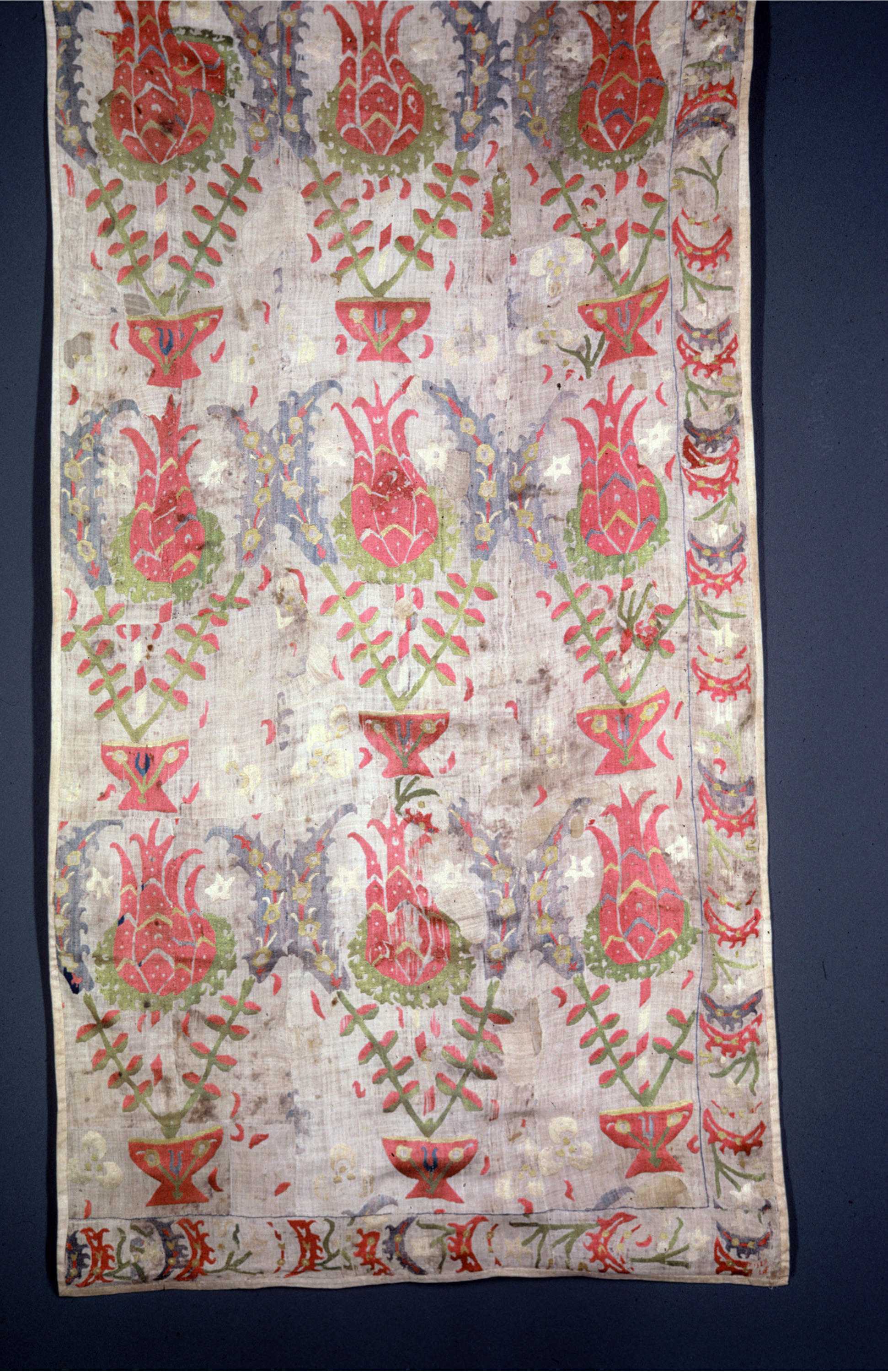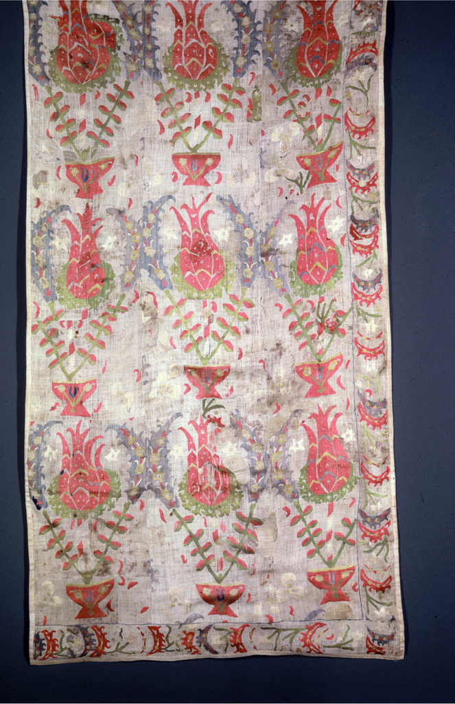 This is a panel. It is dated 18th–19th century and we acquired it in 1955. Its medium is silk embroidery on linen foundation and its technique is embroidered on plain weave. It is a part of the Textiles department.