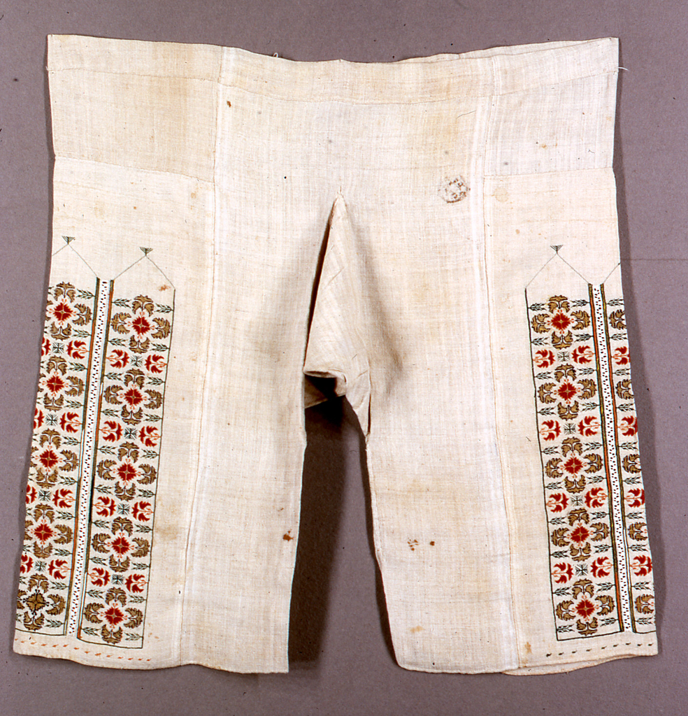 This is a Trousers. It is dated 18th–19th century and we acquired it in 1955. Its medium is silk and metal embroidery on linen foundation and its technique is embroidered on plain weave. It is a part of the Textiles department.