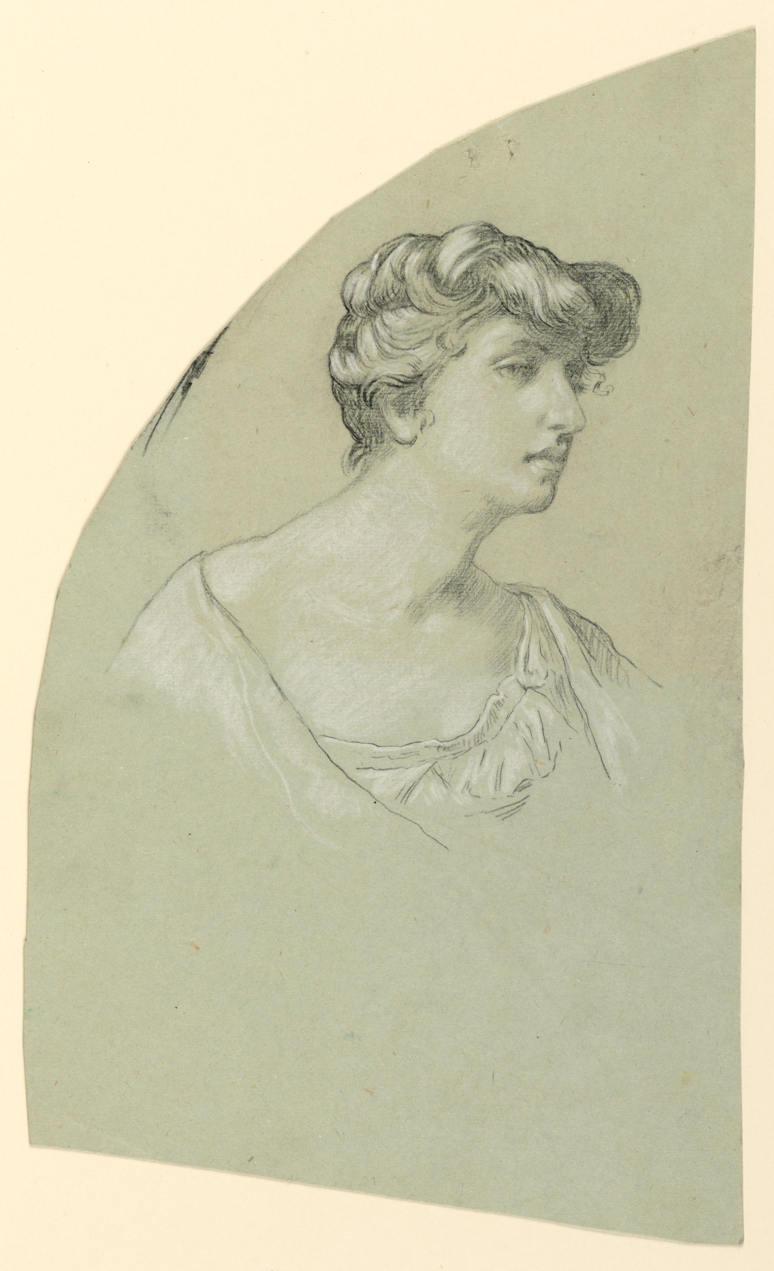 Drawing, Portrait Sketch of a Young Woman; Elihu Vedder (American, 1836 – 1923); USA; black crayon, white chalk, on green paper; 34 x 19.9 cm (13 3/8 x 7 13/16 in.); Gift of the American Academy of Arts and Letters; 1955-38-58