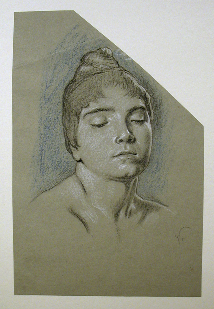 Drawing, Portrait Sketch of a Young Woman with Closed Eyes; Elihu Vedder (American, 1836 – 1923); USA; black, blue crayons, white chalk, on gray paper; 21.5 x 14.3 cm (8 7/16 x 5 5/8 in.); Gift of the American Academy of Arts and Letters; 1955-38-71