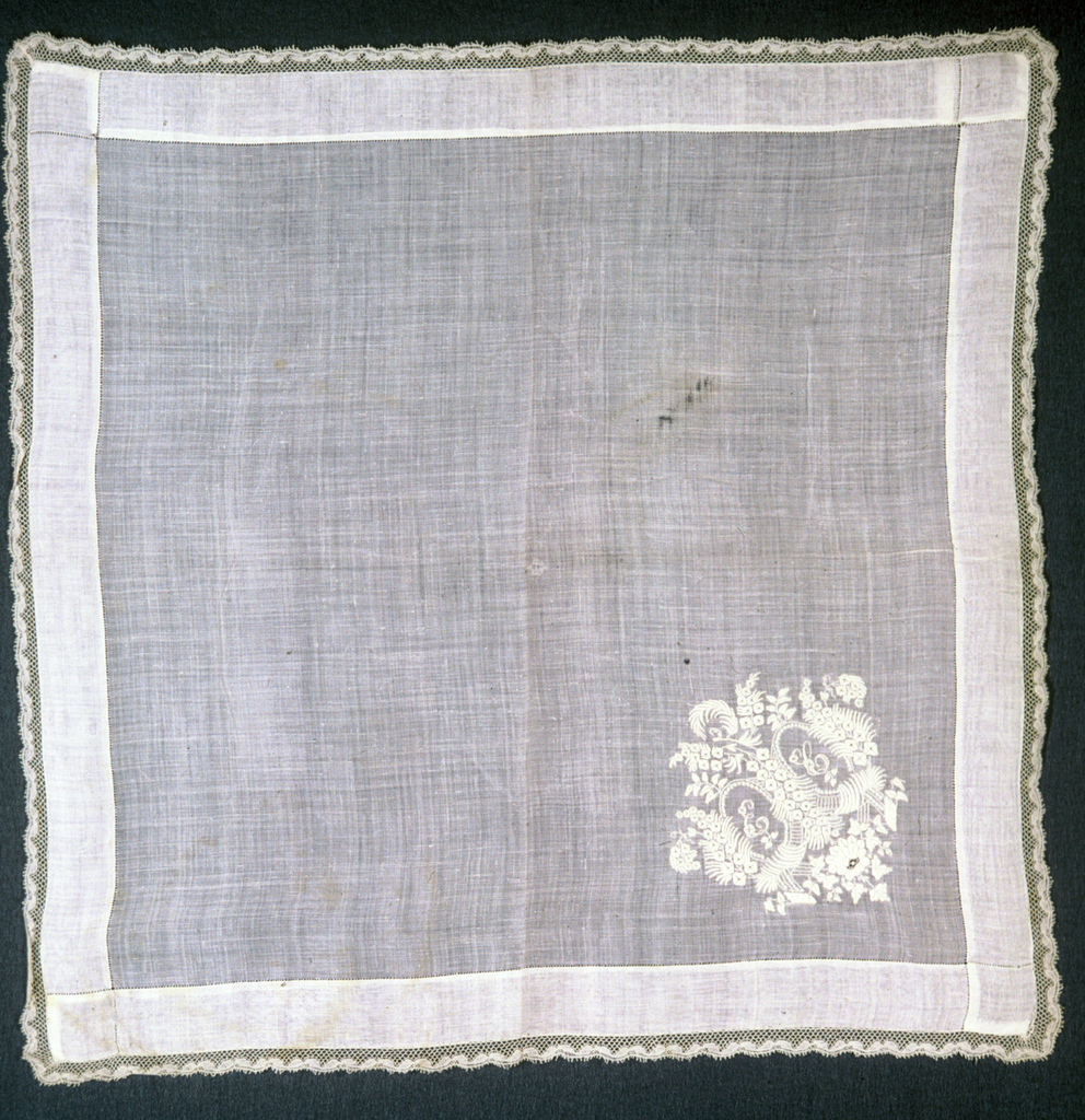 This is a Handkerchief. It is dated ca. 1850 and we acquired it in 1955. Its medium is linen and its technique is embroidered. It is a part of the Textiles department.