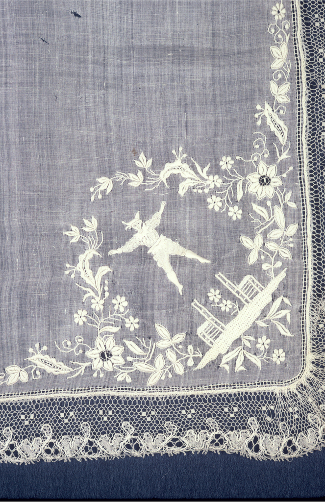 This is a Handkerchief. It is dated mid- 19th century and we acquired it in 1955. Its medium is linen and its technique is embroidered. It is a part of the Textiles department.
