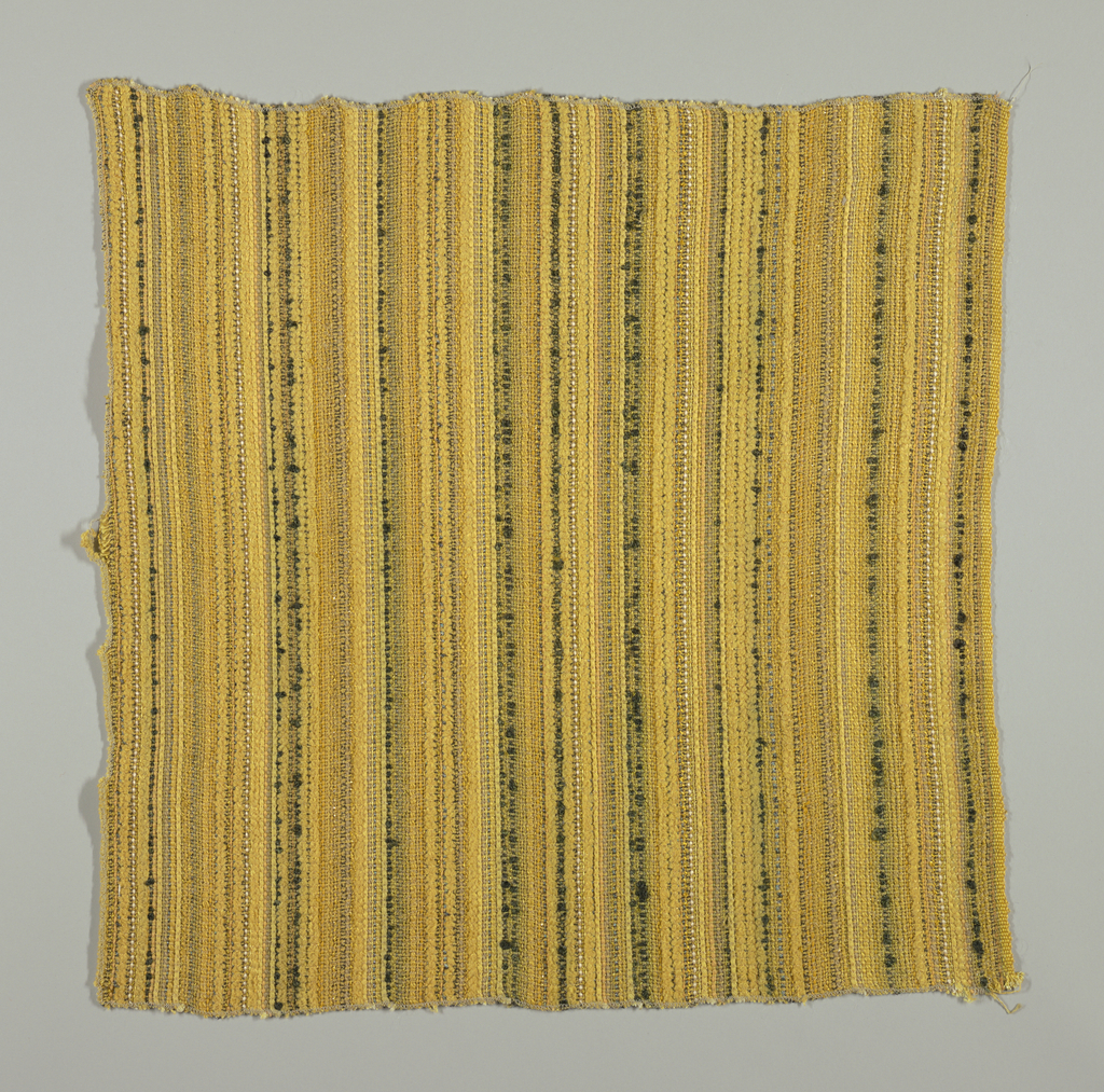 This is a Sample. It was designed by Jack Lenor Larsen and produced by Jack Lenor Larsen Incorporated. It is dated 1950–55 and we acquired it in 1955. Its medium is warp: acetate, cotton, viscose, metallic, jute; weft: cotton, mohair, viscose and its technique is plain weave. It is a part of the Textiles department.