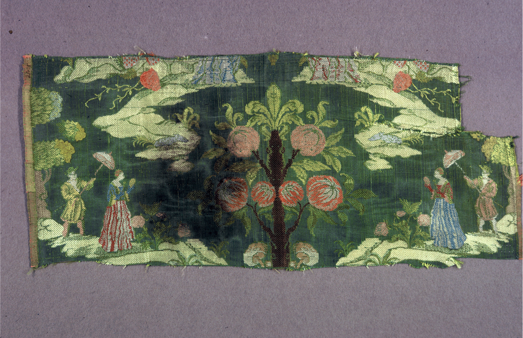 This is a Fragment. It is dated mid- 18th century and we acquired it in 1955. Its medium is silk, wool and its technique is plain weave with discontinuous supplementary weft patterning (brocade). It is a part of the Textiles department.