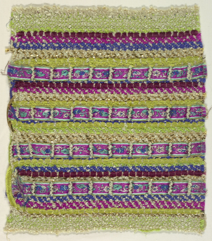Sample (USA); Designed by Dorothy Wright Liebes (American, 1897–1972); cotton, viscose rayon, silk, coated paper, cellophane-laminated aluminum yarn, cellulose acetate-laminated aluminum yarn; H x W (sample): 27.2 × 24.1 cm (10 11/16 × 9 1/2 in.); Gift of Mrs. Morris D.C. Crawford; 1955-71-7