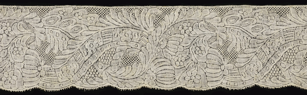 This is a Border. It is dated 18th century and we acquired it in 1956. Its medium is linen and its technique is bobbin lace, binche style with binche ground. It is a part of the Textiles department.