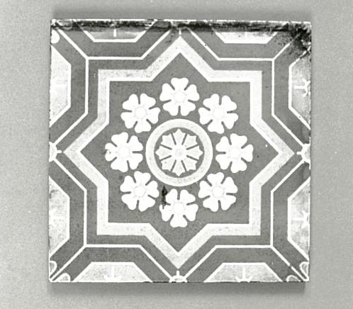 This is a tile. It is dated ca. 1900 and we acquired it in 1956. Its medium is stenciled and glazed earthenware. It is a part of the Product Design and Decorative Arts department.