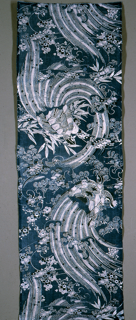 This is a Textile. It is dated late 19th century and we acquired it in 1956. Its medium is cotton and its technique is plain weave, patterned with stencil-applied paste resist (katazome) indigo dyed. It is a part of the Textiles department.