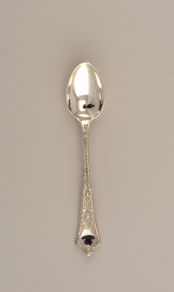 This is a spoons. It was designed by Edward C. Moore (1827-1891) and made by Tiffany and Co. and manufactured by Tiffany and Co. and retailed by Tiffany and Co.. It is dated patent 1872, produced 1872-1875 and we acquired it in 1957. Its medium is silver. It is a part of the Product Design and Decorative Arts department.